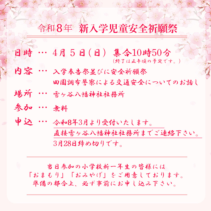 伝統により地域の安寧を守りつづける雪ヶ谷八幡神社は、秋の祭礼と共に、年中行事といたしまして 『新入学児童安全祈願祭』 を永年にわたり雪ヶ谷八幡神社氏子青年会奉仕により開催しております。